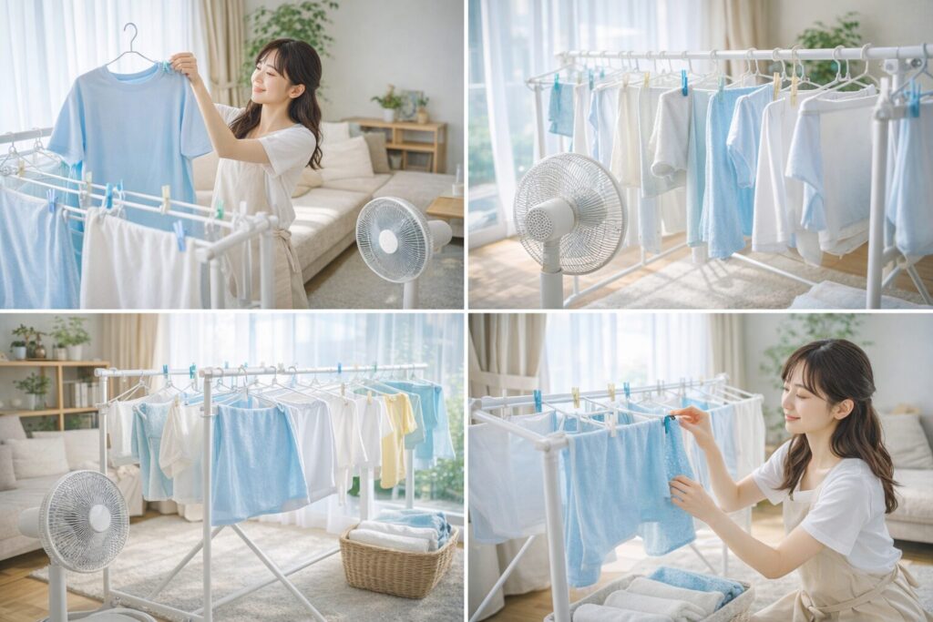 - 部屋干しなら風の通り道を作る(扇風機でOK)